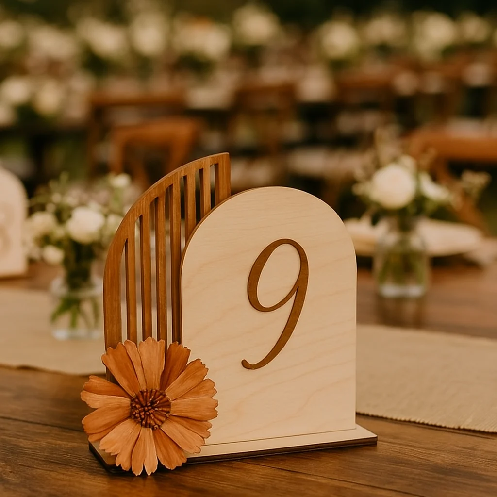 Os números de mesa modernos são uma escolha elegante para eventos com decoração contemporânea. O modelo Número de Mesa Arco apresenta uma composição criativa, com um painel em madeira clara, acabamento arredondado e detalhe lateral ripado em tom mais escuro.